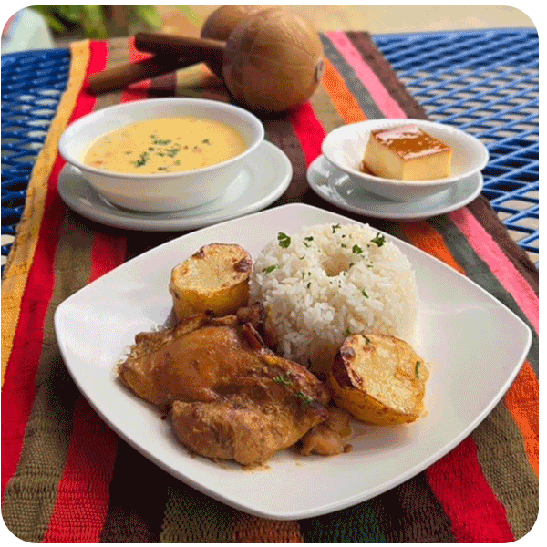 Option 1: $12 Chupe de Pascado (Fish Chowder) Fritada (Braised Pork and Corn) Dessert of the Day or Oatmeal Drink Option 2: $12 Mini Ceviche (Small Shrimp Ceviche) Bistec de Carne (Beef Strips and Rice) Dessert of the Day or Soda